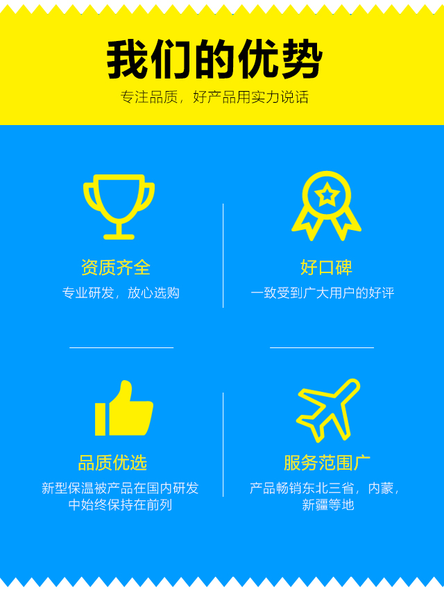 我們本著客戶之上,服務至上的原則,爭創(chuàng)國內保溫被行業的引導者。